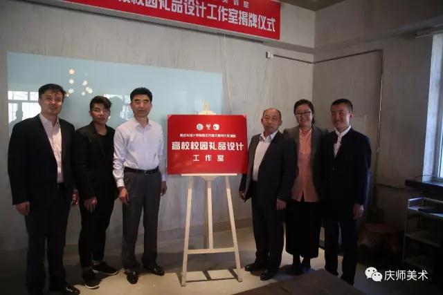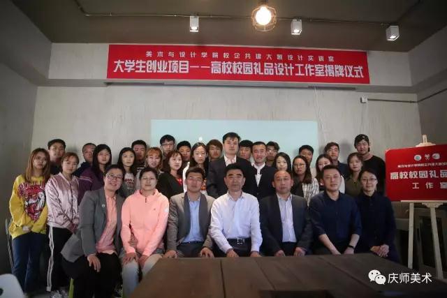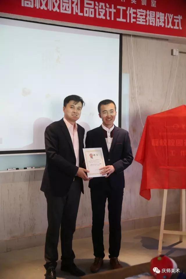 刘:是的,这是“实战导入”法的教学成果之一,在校企共建实训室实训实践过程中,与员工碰撞出有关设计应用的‘火花’。所以,在申报黑龙江省老员工创新创业项目的基础上,带领员工进行创业项目实践,并于2017年5月7日举行高校校园礼品设计工作室揭牌仪式,公司党委副书记刘恒和伟德体育经理孙大力共同为工作室揭牌(图7、图8)。工作室从项目策划案的思考到礼品设计的定位及工作室的筹建等,由在校生白岩松主要负责,我和大象设计实训室支持协助研发庆师高校校园设计衍生品。