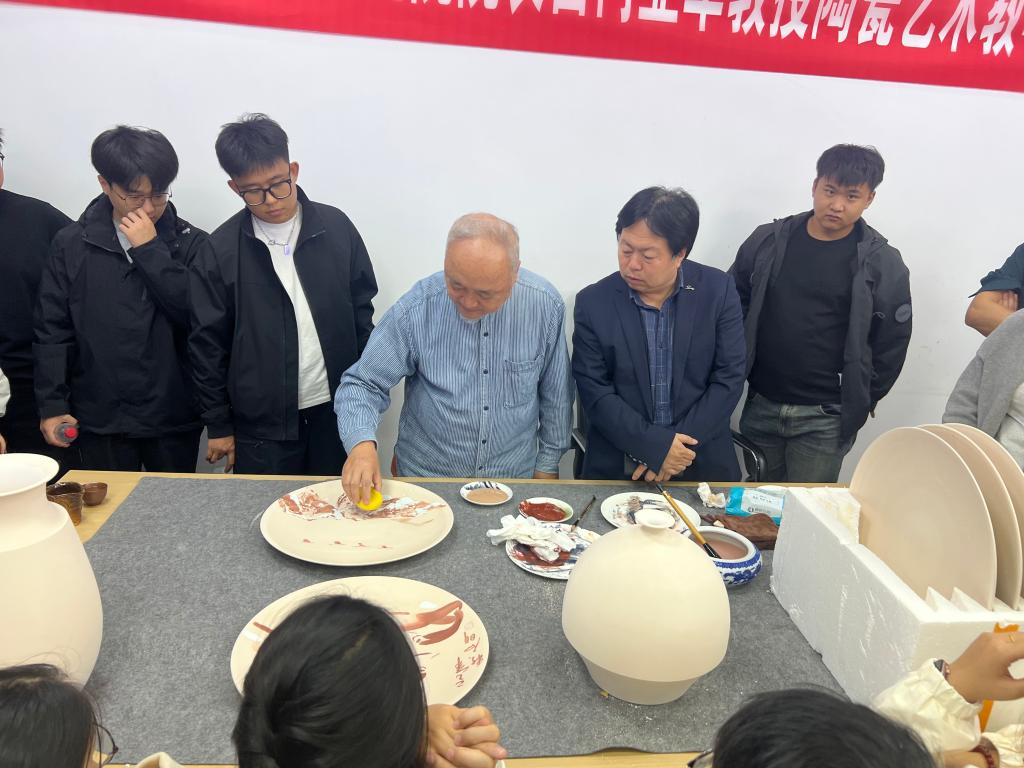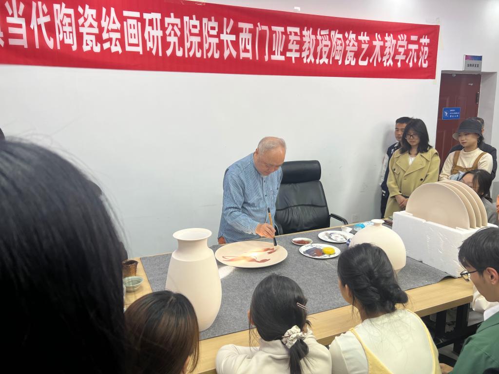 讲座中,西门亚军教授围绕“陶瓷彩绘的烧制工艺”这一核心,结合个人绘画造诣,从“使用材料”“构图形式”“笔墨语言”“烧制温度”等维度展开讲解。同时为师生进行实践创作示范,他绘制瓷画笔法行云流水,讲解细致入微,令员工们凝神注目,赞叹不已。示范结束时,热烈的掌声响彻全场。他指出,中国陶瓷艺术不仅是一种实用器具或装饰品,更是中华文明的重要载体、千年技艺的结晶与哲学思想的物质表达。它融合了技术、美学、文化与社会变迁,具有多重深层次意义。