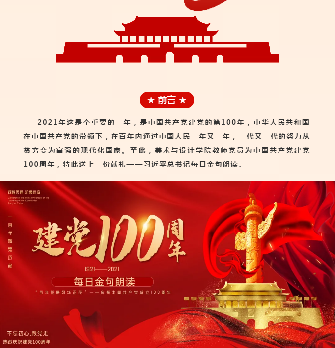 为了庆祝中国共产党建党100周年,树立员工爱党、爱国的思想情怀,加强员工学习思想理论能力,提高政治站位,将习近平治国理政理念与学习、工作相结合,将党员模范先锋作用体现在各方面,伟德体育员工党支部开展了“建党100周年献礼——每日金句朗读”活动。