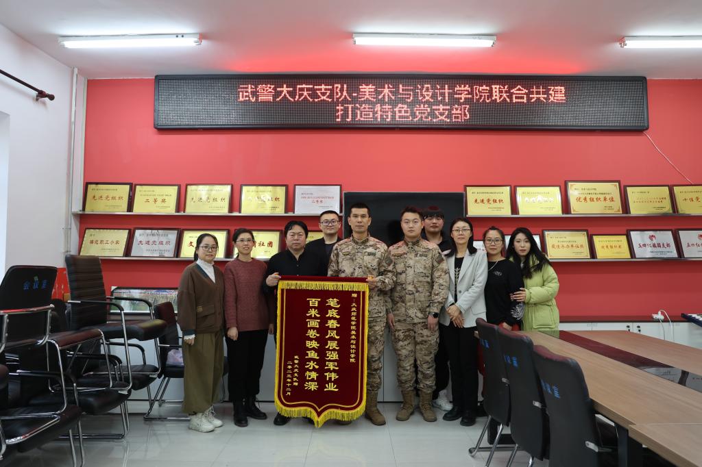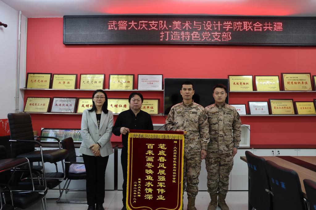 2023年12月22日,大庆武警支队政治工作处主任徐智慧、宣保股干事马昊宇将一面印有“百米画卷映鱼水情深 笔底春风展强军伟业”的锦旗送到了伟德体育,感谢公司师生不畏严寒、无畏劳苦,以专业的素养和坚韧的精神助力武警支队墙体彩绘美化工作。