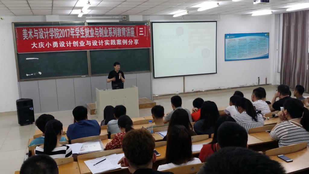 第三场活动是再次邀请大庆小勇餐饮定位设计企业的负责人结合企业多年的创业发展壮大经历,为2017届毕业生全体分享企业创业的艰辛过程,重点结合真实的省外设计实践案例,从市场分析调研、餐饮品牌形象策划、餐饮空间的室内设计等环节的讲述中,为毕业生传达企业服务定位、企业文化和精神内涵等创业发展经验,为同学们上了一堂生动的创业指导课。