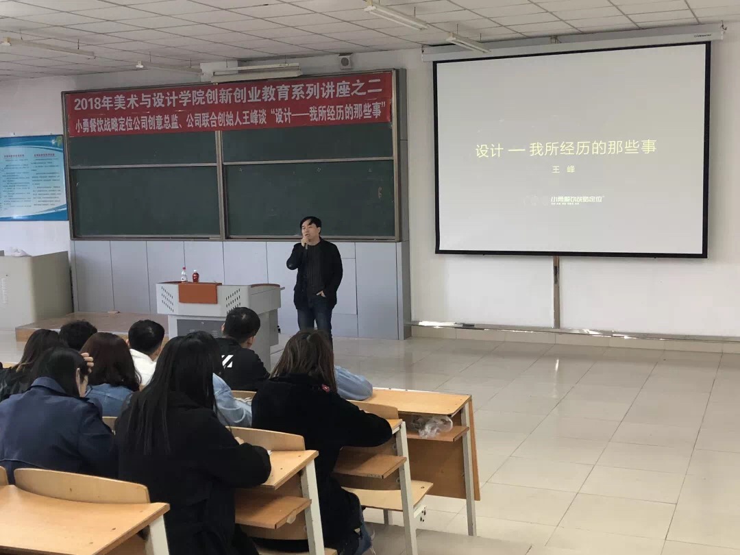 主讲人王峰凭着自己在设计界积累的经验和丰富的阅历,给同学们讲解和分析了许多设计作品中的优秀案例以及自己创业过程中的事迹。