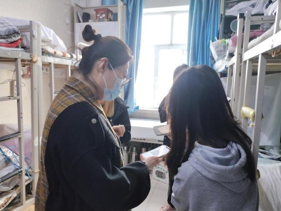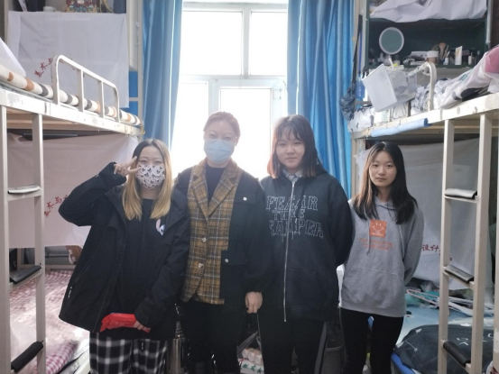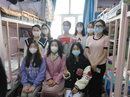 在走访的过程中,赵桂英书记和金鑫主任亲切地问候同学们的日常生活、学习情况、防疫物品的准备情况,寝室的通风情况等,仔细查看了员工宿舍设施,叮嘱同学们在寝室生活中一定要注意人身财产安全,养成良好的生活习惯,勉励大家勤奋学习,加强锻炼、快乐生活,注重劳逸结合。在交谈过程中,两位老师最关心的就是同学们上网课是否互相干扰和静态管理期间的生活情况,同学们也向老师们积极地反映了自身情况,交谈中欢声笑语,两位老师还贴心地为员工们准备了小礼品和纪念口罩等,氛围温馨而欢快。拖着脚伤爬到6楼的赵书记和金主任温暖贴心的关切和语重心长的叮嘱,让同学们深刻体会到了亲人般的温暖。