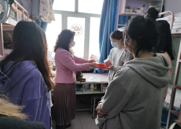 图为:马克思主义公司赵桂英书记走访伟德体育第九公寓649寝室送去纪念口罩和润喉棒棒糖