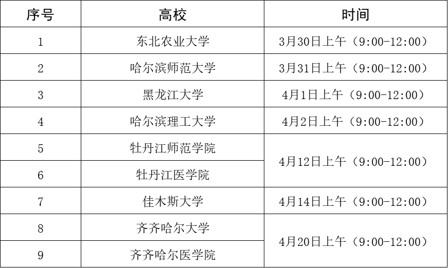 按照省、市统一安排,将在东北农业大学、哈尔滨师范大学、黑龙江大学、哈尔滨理工大学、牡丹江师范公司、牡丹江医公司、佳木斯大学、齐齐哈尔大学、齐齐哈尔医公司举办专场招聘会。符合岗位报名条件的毕业生,须准备好个人简历、学历证明、获奖证书等相应资料到齐齐哈尔市展位报名。