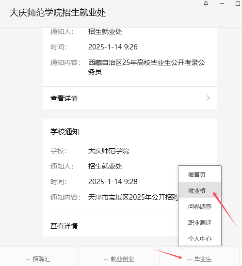 2.然后在“毕业生选项”选择‘就业桥’,进入第二个界面,开始进行求职。用户名是学号,密码是身份证后六位。