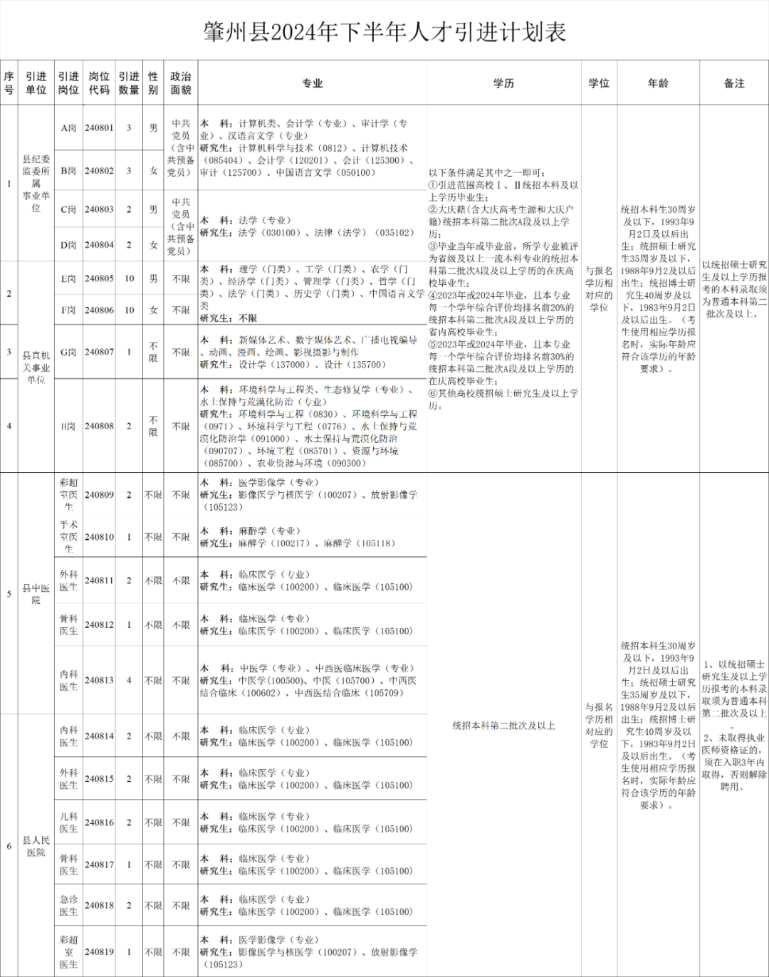 计划为县直机关事业单位引进人才23人、县纪委监委所属事业单位引进人才10人、县属医院引进人才20人,具体引进岗位数量和要求详见《肇州县2024年下半年人才引进计划表》(附件1)。