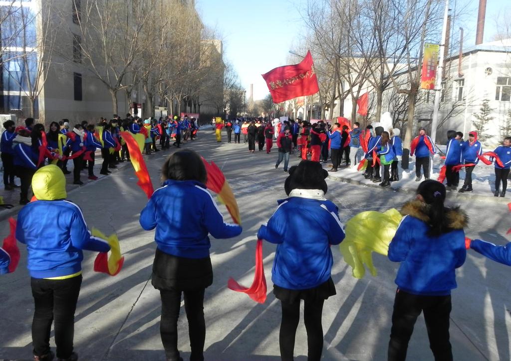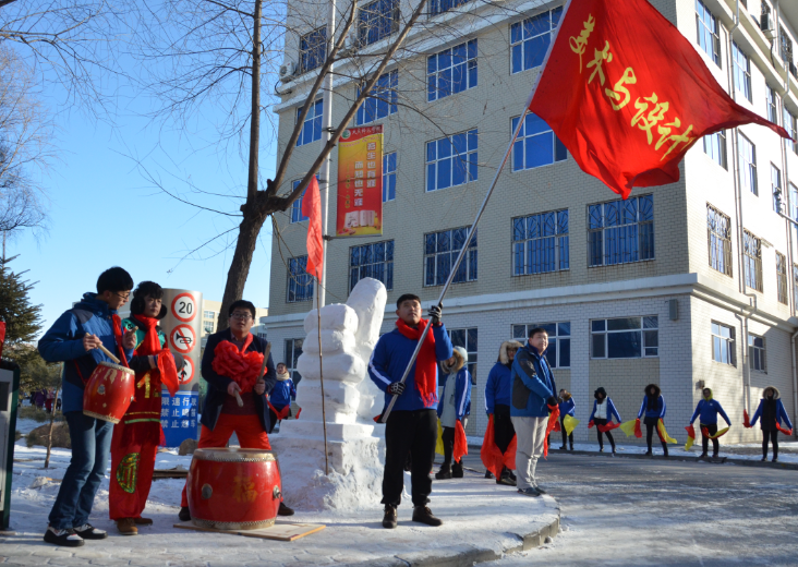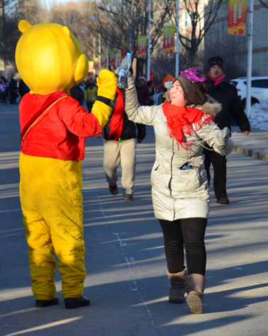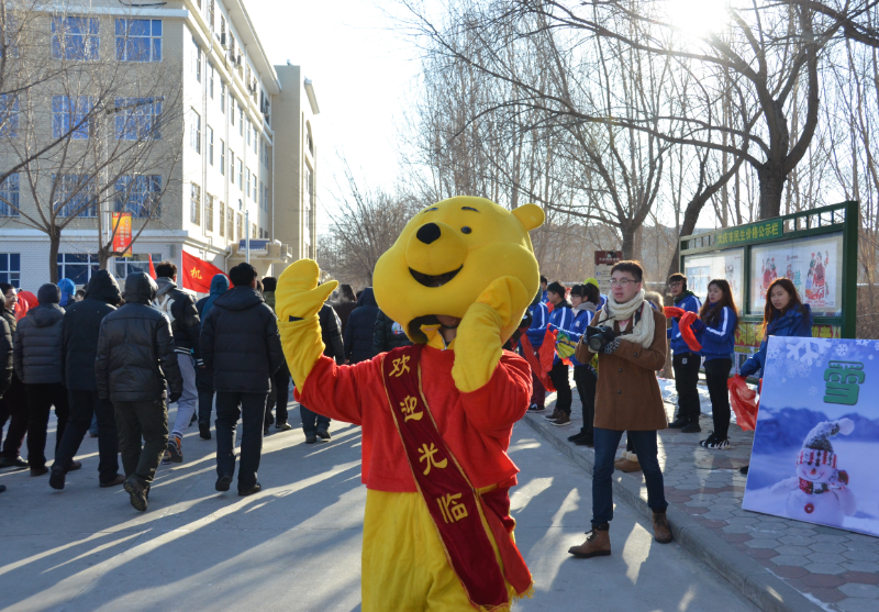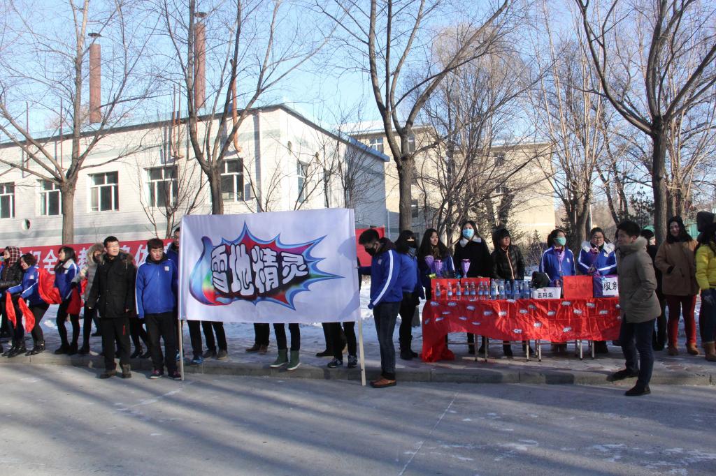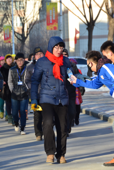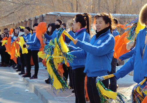 员工啦啦队也随着老师们的努力更热情似火,坚持在寒风中欢呼站立约三个小时。同学们为老师加油鼓劲、呐喊助威,并且还在“加油手势的雪雕”前跳起了热闹的加油舞。供给站里有很多员工在为照顾老师们而忙碌着,一边为老师们加油喝彩、问寒问暖,一边送上一瓶瓶充满爱心的纯净水。员工加油站、拉拉队获大赛“优胜表演奖”。