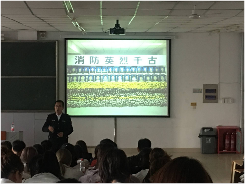 首先,王教官为大家讲解了基本消防安全制度,并简要介绍相关法律法规,旨在使大家形成基本消防观念。而后,王教官结合亲身经历实际案例,并配合一幅幅触目惊心的图片、一段段发人深省的视频,生动的讲解了消防安全知识。听众席不时传来惊异之声,甚者拿出手机拍照,表现了对讲座内容的重视。接下来,王教官介绍了常规消防设施的使用,并现场演示了报警器、灭火器的正确使用方法,让大家对消防知识有了更直观的了解。