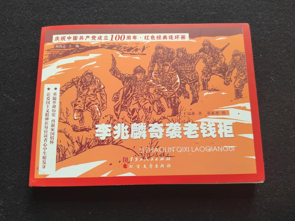 董新杰教授应黑龙江人民出版社和北方文艺出版社邀请,创作完成了《李兆麟奇袭老钱柜》(ISBN 978-7-5317-4610-2)连环画创作任务,全书共计120页,历时2个月时间,现已经出版发行。此书描绘的是东北抗日联军著名将领李兆麟指挥的一场著名战斗——奇袭老钱柜。此战是东北抗日武装战斗中以少胜多、运用指挥获得胜利的典型战例之一,充分反映出李兆麟的足智多谋和抗日战士与敌作战的英勇果敢,他将一生完全献给了中华民族的解放事业,至死不渝。此书的出版发行是即《铁人王进喜》连环画(ISBN 978-7-5575-4177-4吉林美术出版社)的又一部精品力作问世,也是董新杰教授为中国共产党建党100周年所献的一份厚礼。