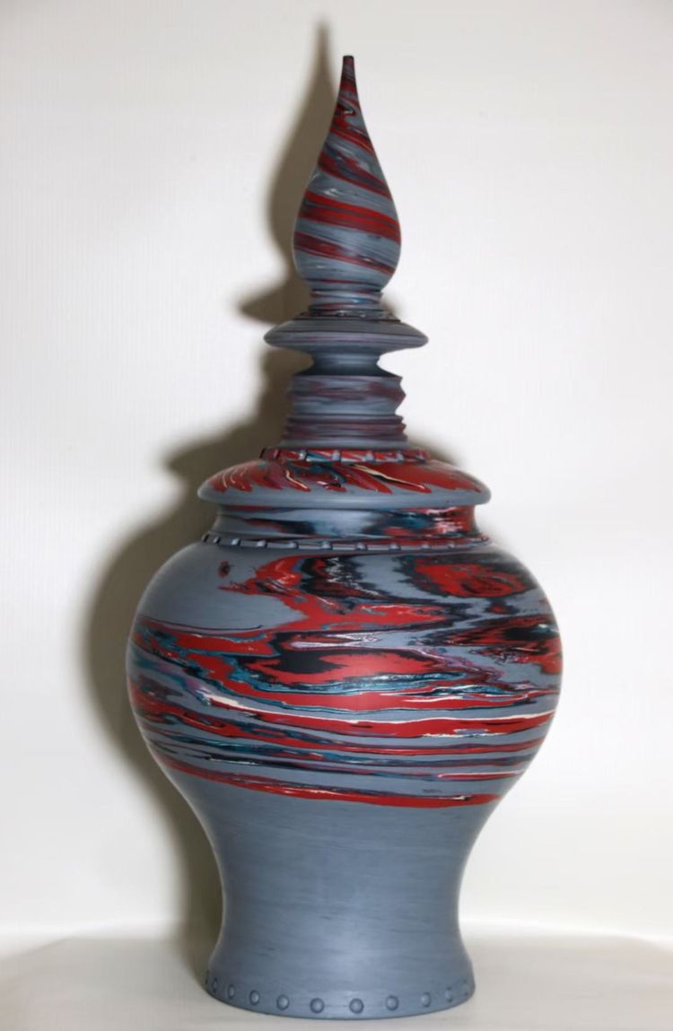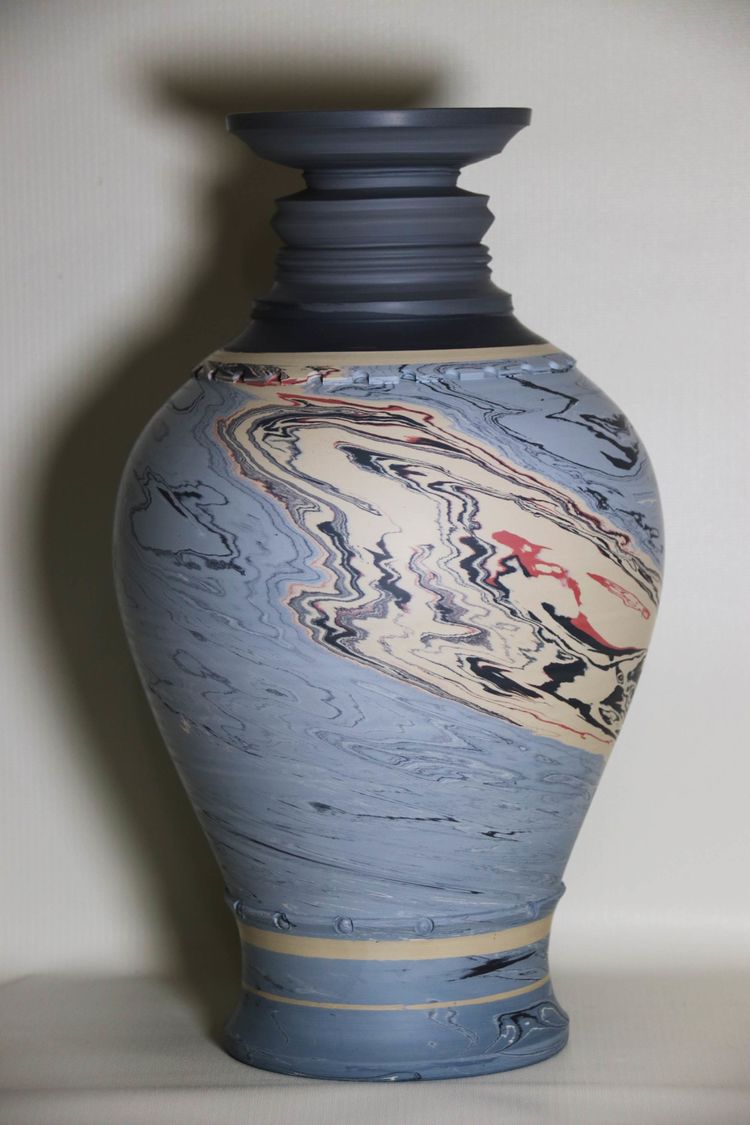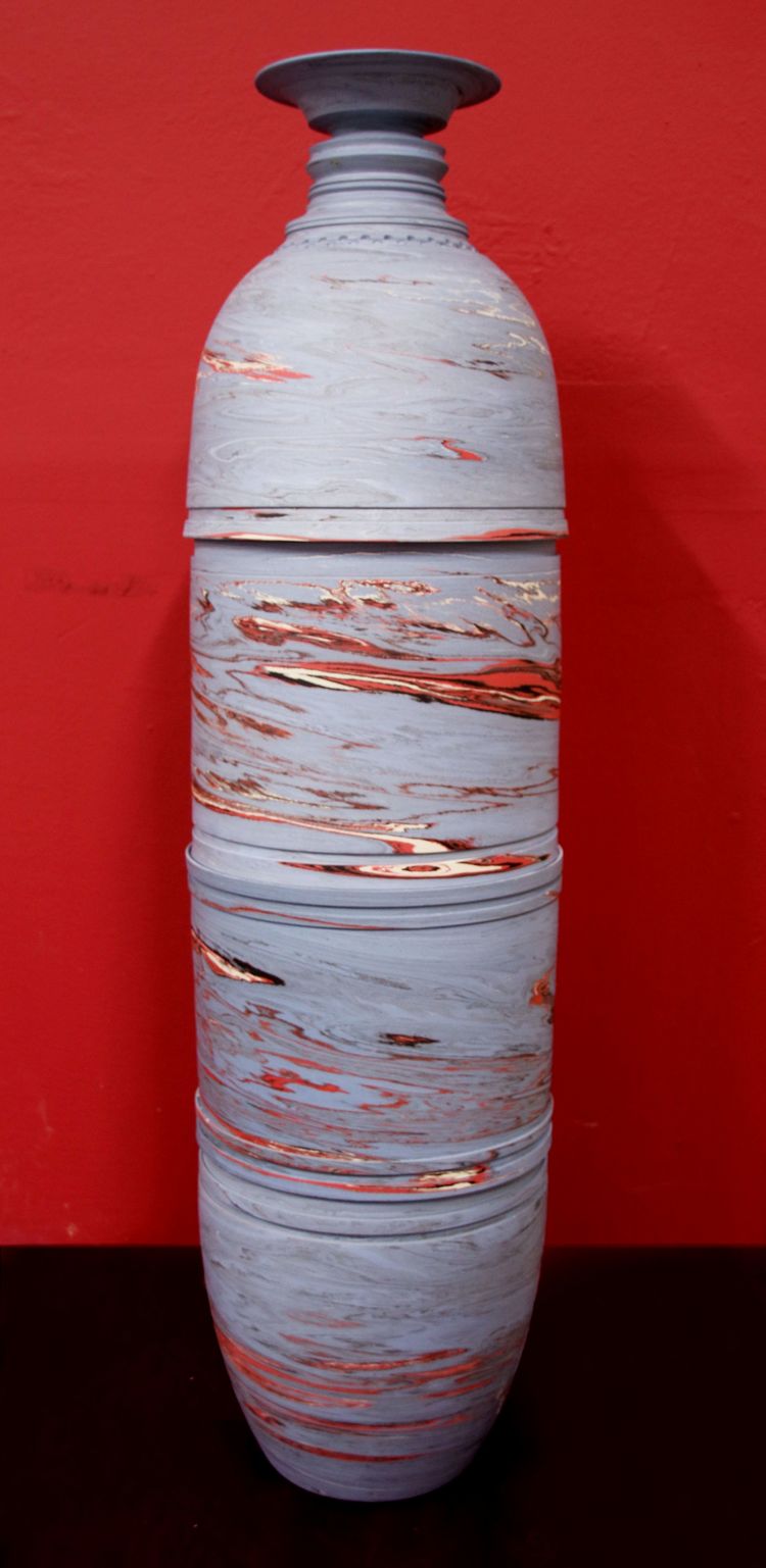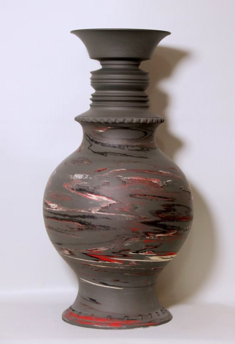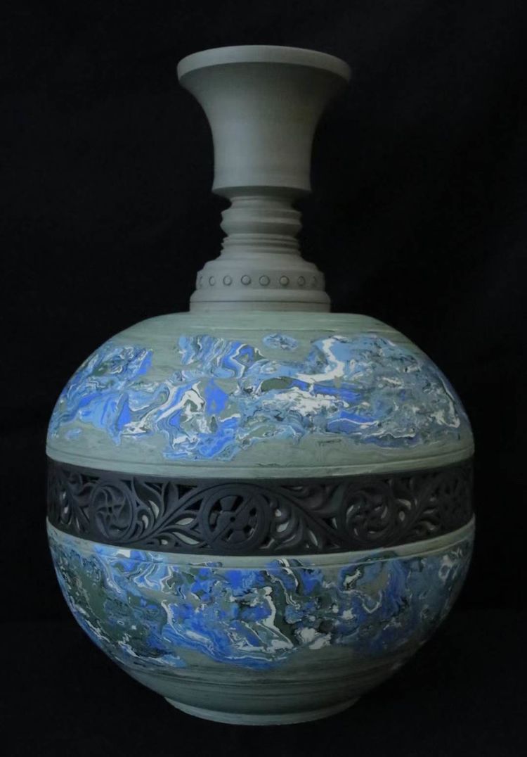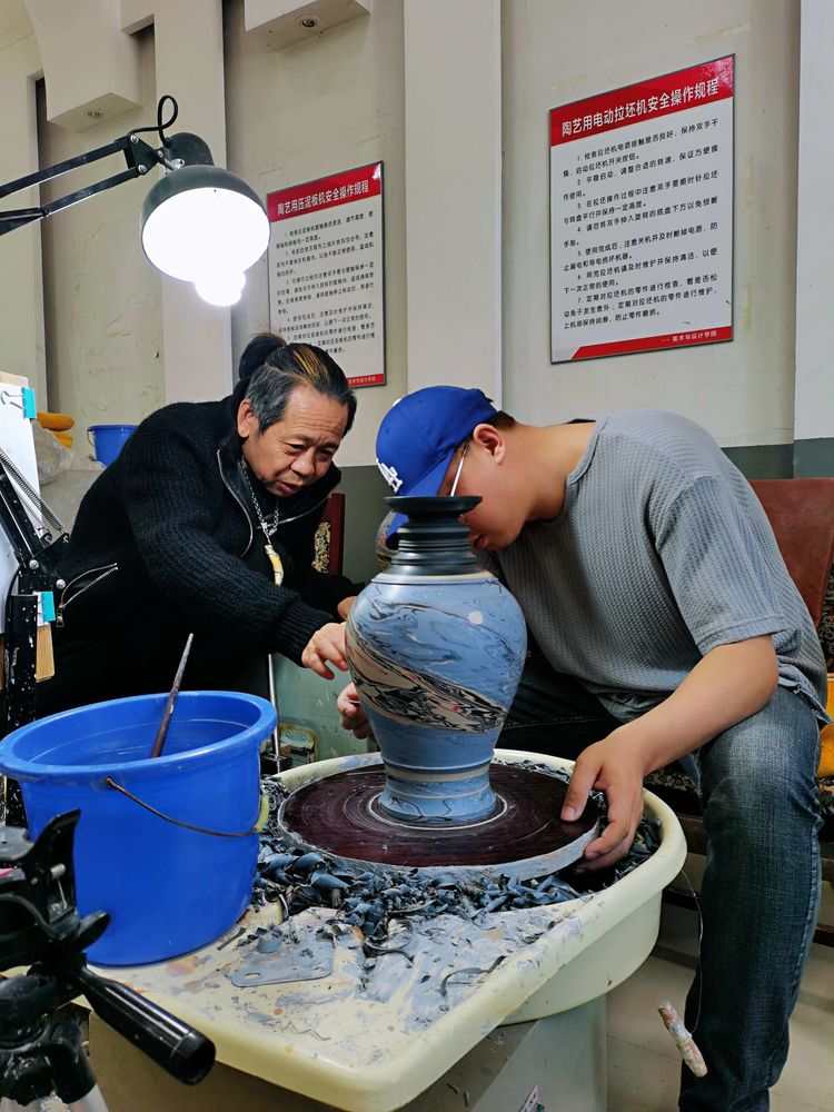 在公司党委宣传部、科研处等部门的关心协调下,伟德体育组织大庆油陶团队召开动员会,并多次在陶艺与装饰设计实训室现场分析研讨。大庆油陶团队在李方海教授带领下,聘请山东、辽宁、大庆等地的几位陶艺大师和雕刻家参加设计制作和雕刻,共同研发一批“油陶杂彩”作品。油陶杂彩的制作研究不仅是丰富单色油陶艺术的需要,也是通过进一步探讨油陶杂彩烧成技术,融合色彩、纹样、图形联想等拓展审美意蕴,丰富陶艺的品类,在陶艺历史上又一新的突破。作品中利用历史名人、英雄形象、时代楷模,双观图形式(图底反转)巧妙融入到《铁人瓶》系列中,诠释大庆精神和铁人精神。
