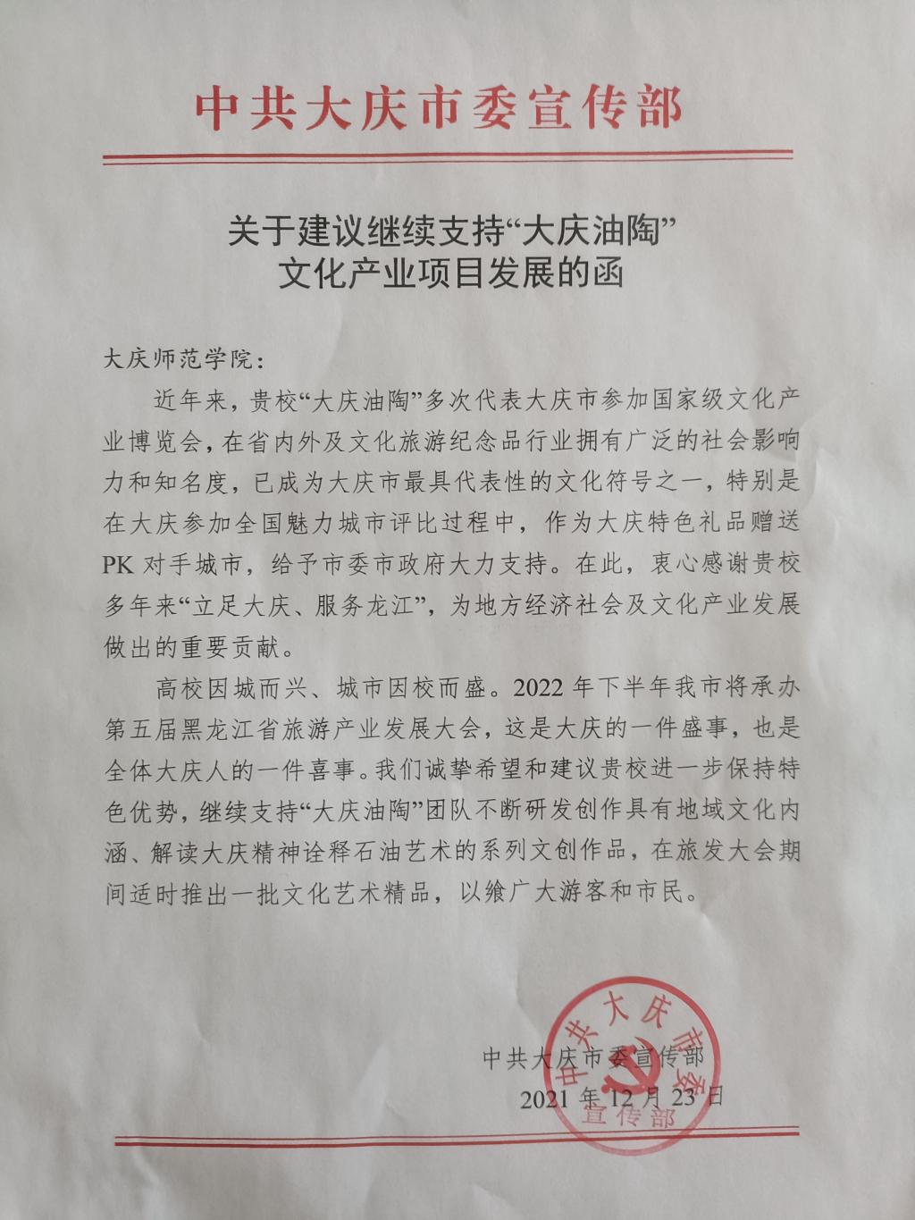 2022年下半年我市将承办黑龙江省第五届旅游产业发展大会,这是大庆的一件盛事,也是全体大庆人的一件喜事。为此大庆市委宣传部在2021年12月23日向公司发来函件,希望公司继续支持“大庆油陶”团队研发创作具有地域文化内涵,解读大庆精神,诠释石油艺术的系列文创作品,在旅发大会期间适时推出一批文化艺术精品。