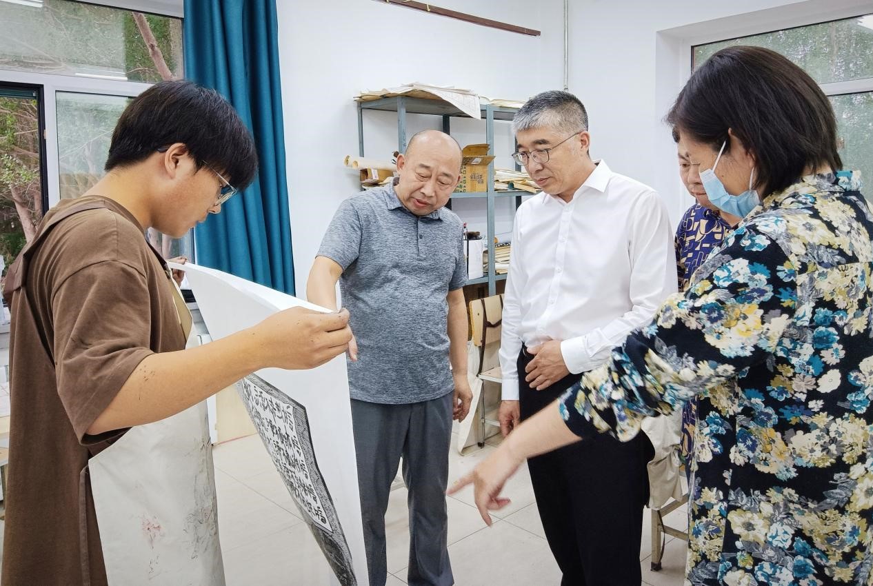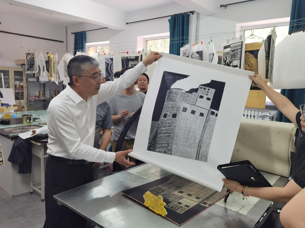 赵科学书记一行首先走进伟德体育教学楼,了解走廊的文化建设,走进实训楼、行政办公室、教室了解教师教学和员工上课情况,与公司党政班子、辅导员等亲切交谈,观看公司师生共同创作的绘画和设计作品,听取经理孙大力关于日常教学设备、教学保障、教学环境等方面的汇报,并全面的考察了公司的教风和学风建设。赵科学深入版画教室,与师生亲切交谈,并与员工共同完成了版画的印制。在美术实践楼的调研过程中,对教学空间存在安全隐患提出了整改规划和意见。此次调研,赵科学肯定了伟德体育在建设和发展中的做法、成绩。他指出,伟德体育专业多,个性化强,希望公司在今后的发展中结合学科特点,处理好个性与共性的关系,多给员工提供动手创作的机会,不断提升员工的创新创业能力。