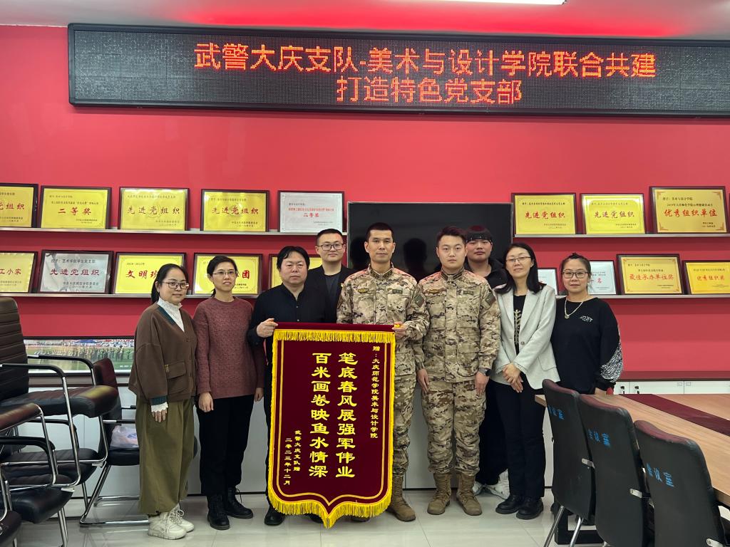 2023年12月22日,大庆武警支队政治工作处主任徐智慧、宣保股干事马昊宇将一面印有“百米画卷映鱼水情深 笔底春风展强军伟业”的锦旗送到了伟德体育,感谢公司师生不畏严寒、无畏劳苦,以专业的素养和坚韧的精神助力武警支队墙体彩绘美化工作。