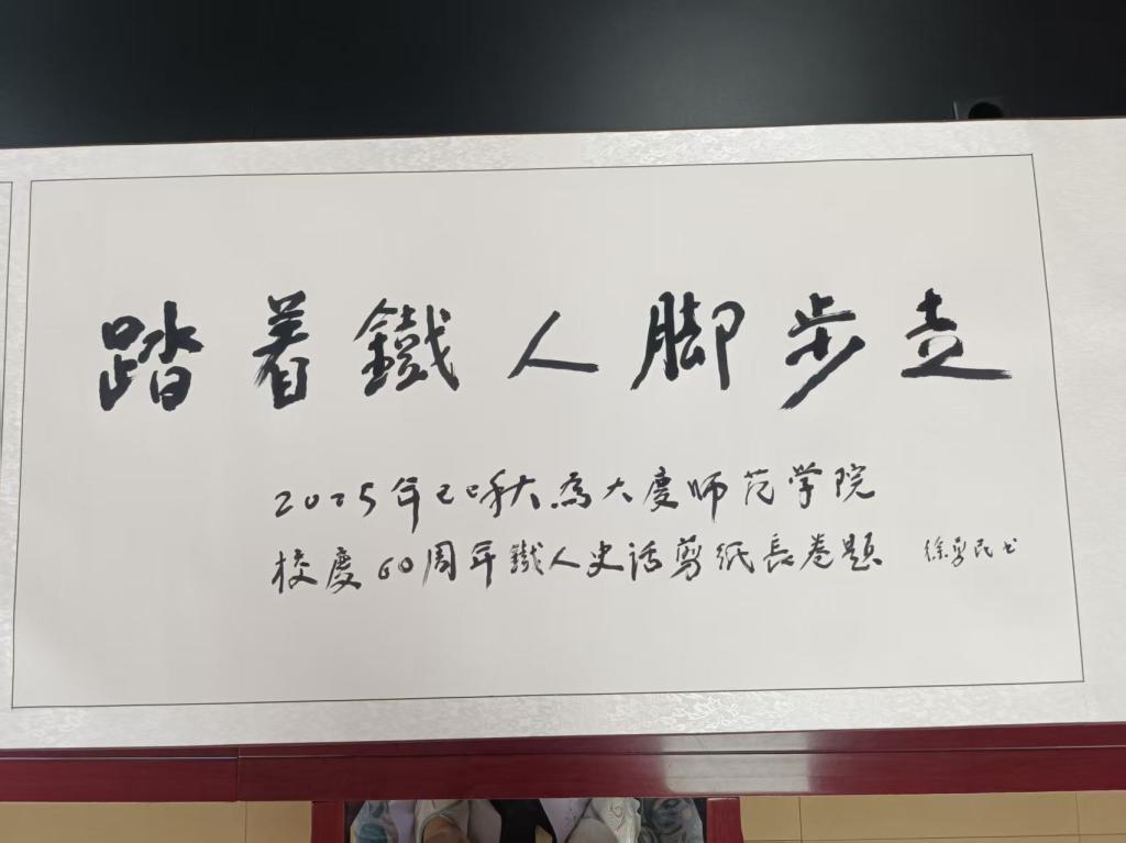 交流会后,徐勇民为公司校庆60周年铁人史话剪纸长卷题写长卷卷首:“踏着铁人脚步走”。