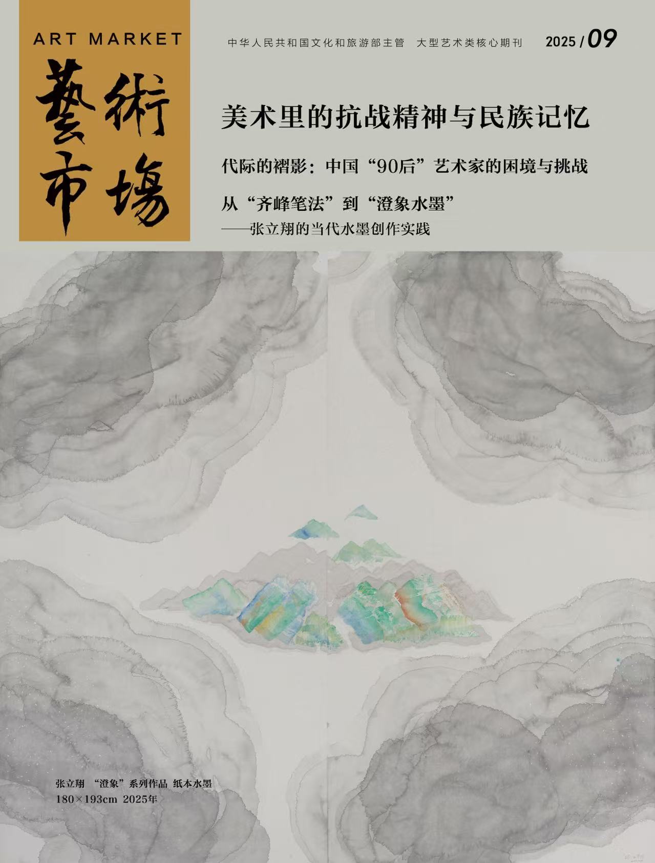 值此Bevictor伟德官网建校60周年之际,公司党总支书记、经理张立翔教授受邀接受文化和旅游部主管 大型艺术类核心期刊《艺术市场》杂志主编武文龙先生的专访------《从“齐峰笔法”到“澄象水墨”----张立翔的当代水墨创作实践》,同时,张立翔教授的水墨作品《“澄象”系列》刊登在《艺术市场》2025年第9期封面。在时代变迁和当代艺术生态加速重构的背景下,他的创作实践与艺术观念,既生发于水墨传统,又直面当下时代议题,为中国当代水墨的发展提供了一份极具启示意义的艺术样本。