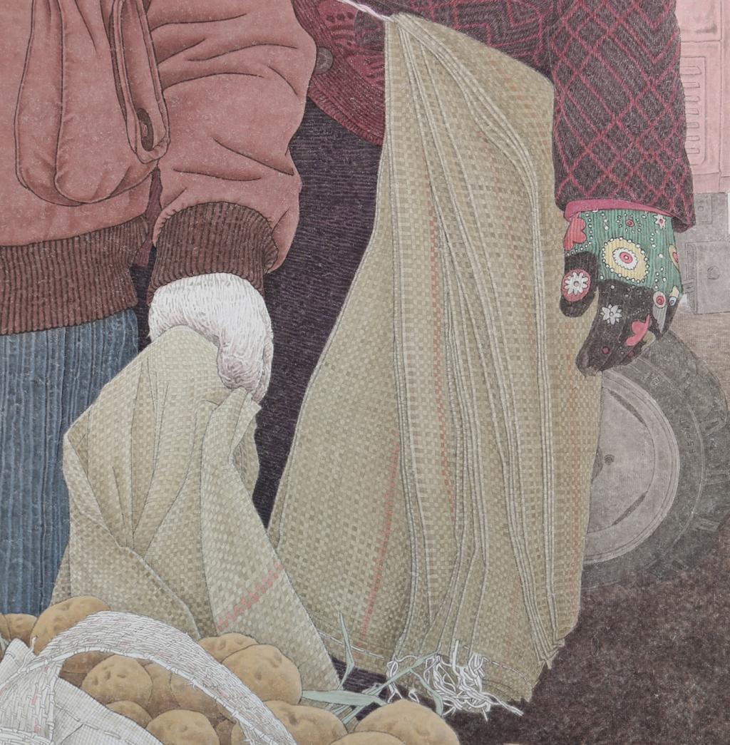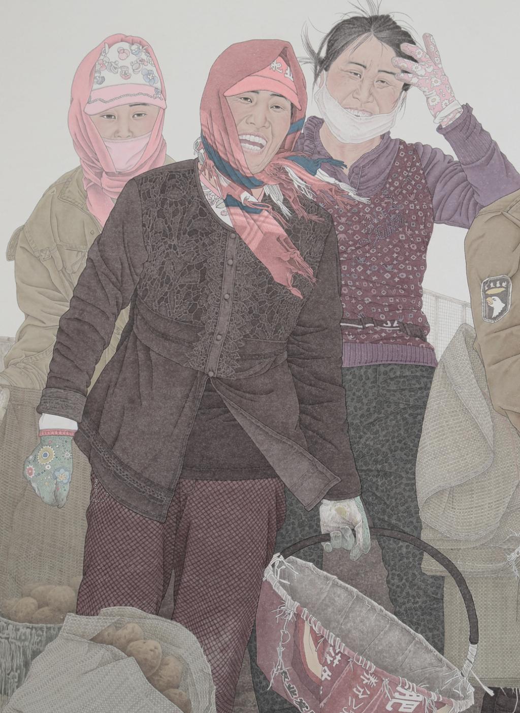 《好日子》题材朴实平常,但作者却以艺术家的全新视角,着力重墨反映新时代中国新农妇的精彩生活。画面具体呈现的是黑龙江农村秋日田地里,农妇收获土豆的喜悦场景。秋风飒飒,一望无际的黑土地,堆积如山的土豆,农妇们聚在一起小憩戏闹,辛勤的汗滴,甜美的微笑,挂上眼角眉梢。透过农妇各式各色的着装与手里的农具,展现新农民的精神欢欣与物质富饶。丰收的喜悦,在风霜雕刻的农妇脸上皱纹里欢蹦乱跳,又活现出东北农妇乐观豁达与吃苦耐劳的坚毅性格。