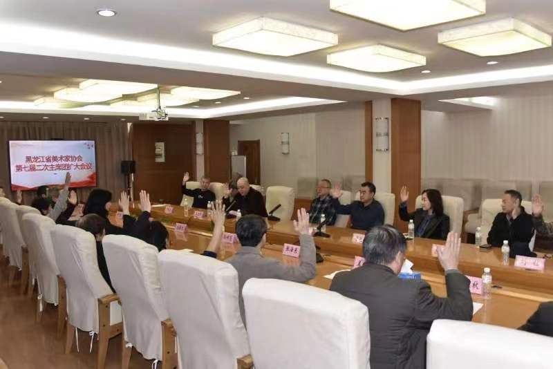3月21日,黑龙江省美术家协会第七届二次主席团扩大会议在省文联以线上线下相结合的形式召开。省文联主席韩会峰,省文联副主席、省美协主席赵云龙出席会议,省美协主席团、理事会理事、艺委会成员以及各市(地)、产行业美协相关成员200余人参会,会议由省美协驻会副主席、秘书长石正军主持。