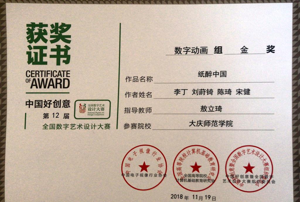 伟德体育高度重视该项赛事,在接到赛事通知后即刻召开师生赛前动员大会,并指派专人负责针对赛事的具体要求和内容做了详尽部署和安排,广大师生也积极进行了设计方案研讨和设计方案创作。投稿前,伟德体育按照公开、公平、公正的原则,组织各专业教师对参赛作品进行了筛选和评比,最终推送了5个参赛队伍(共计14名员工)的5件优秀作品。2018年11月8日,大赛组委会公布了本次赛事的获奖名单,其中由敖立琦老师指导员工李丁、刘莳锜、陈琦、宋健的动画作品《纸醉中国》获数字动画组金奖,赢得奖金10000元,再一次创造了伟德体育学科竞赛成果佳绩。